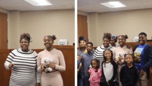 Each child left with a gift basket prepared with care, and each family received Legoland passes to continue the celebration beyond the courthouse walls. Down the hall, community partners set up resource rooms, sharing encouragement and information, while the smell of fresh fruit and pastries drifted through the air. Crumbl Cookies brought an extra sweetness to a morning already full of it.